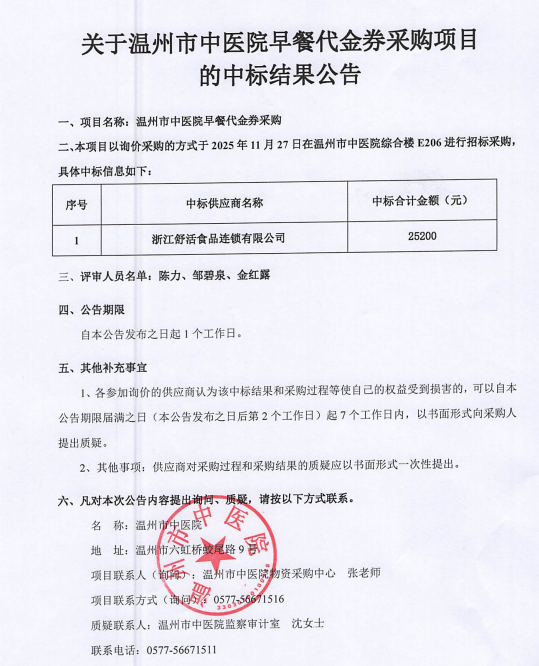 关于温州市中医院早餐代金券采购项目的中标(成交)结果公告