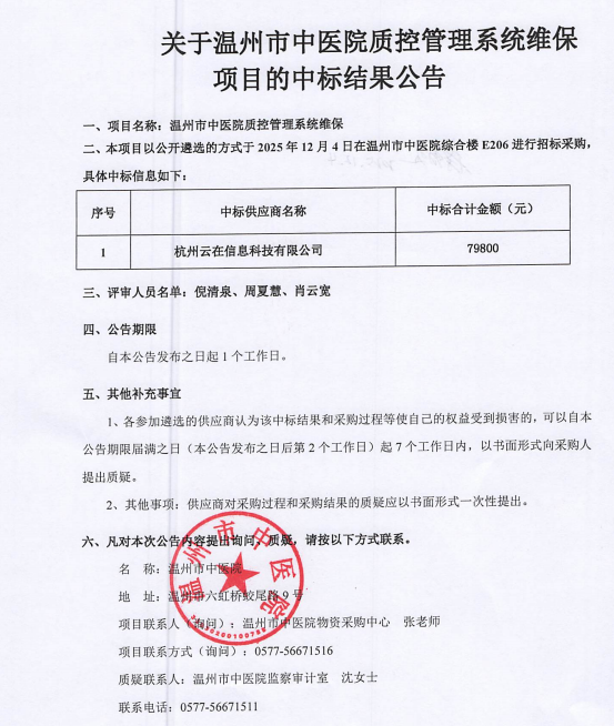 关于温州市中医院护理质控管理系统维保项目的中标(成交)结果公告