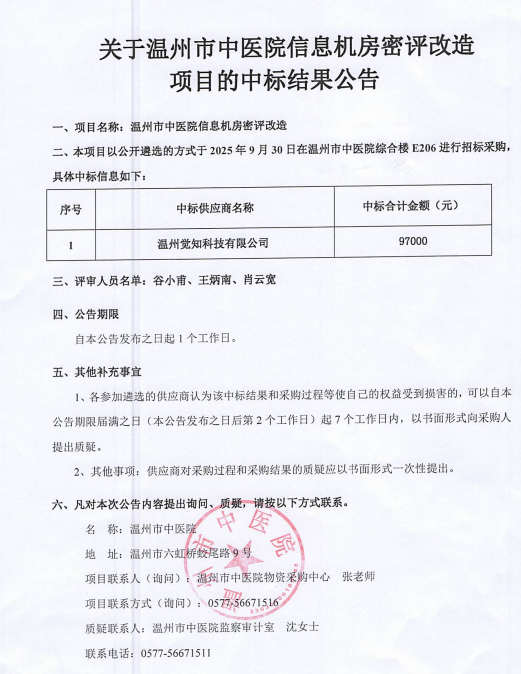 关于温州市中医院信息机房密评改造项目的中标(成交)结果公告
