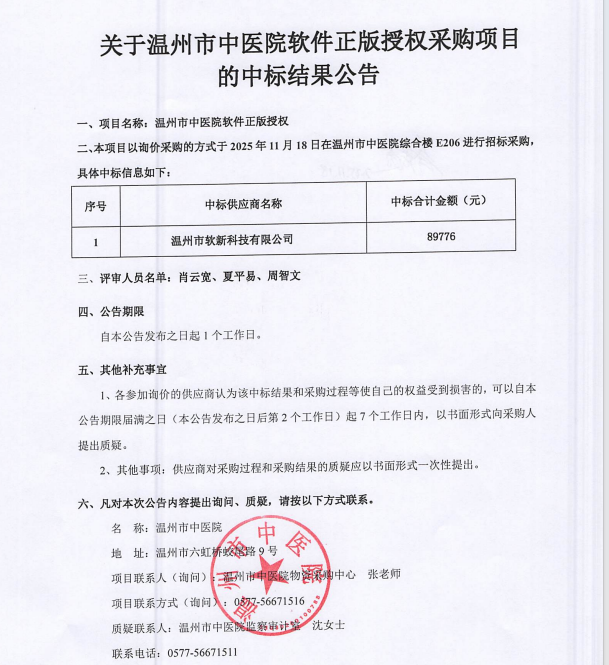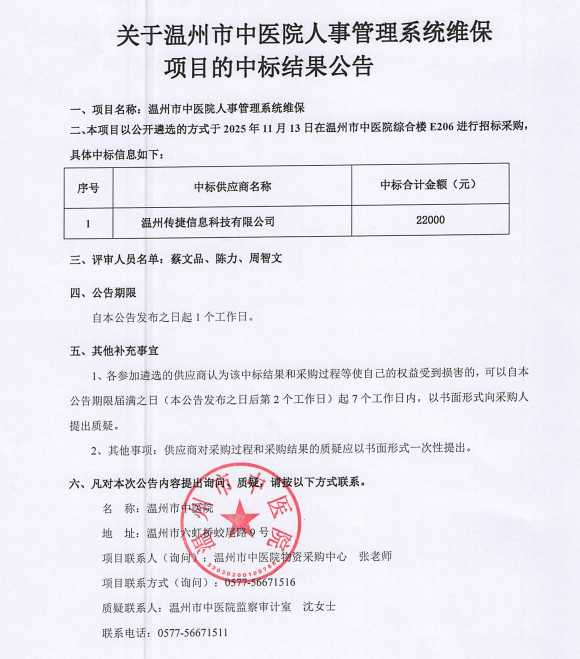 关于温州市中医院人事管理系统维保项目的中标(成交)结果公告