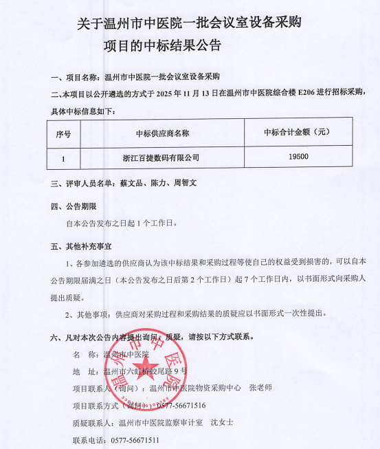 关于温州市中医院一批会议室设备采购项目的中标(成交)结果公告查看详情+