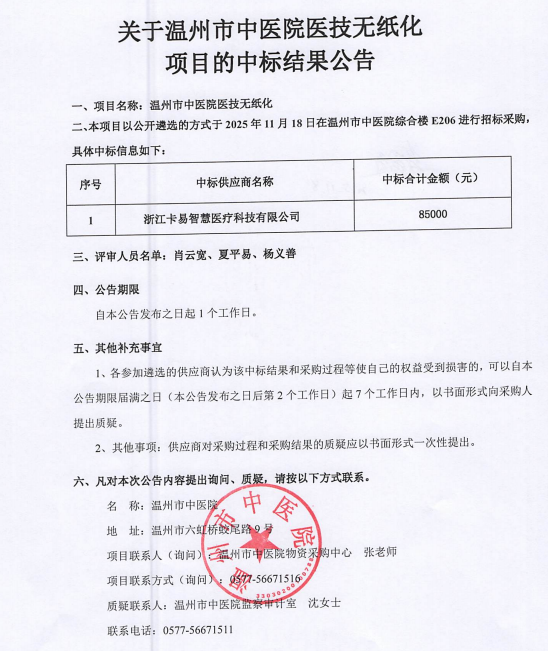 关于温州市中医院医技无纸化采购项目的中标(成交)结果公告