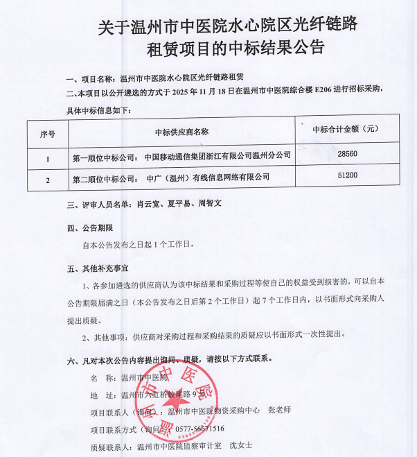 关于温州市中医院水心院区光纤链路采购项目的中标(成交)结果公告
