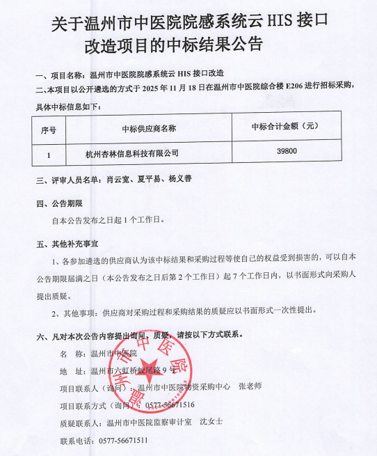关于温州市中医院院感系统云HIS接口改造项目的中标(成交)结果公告