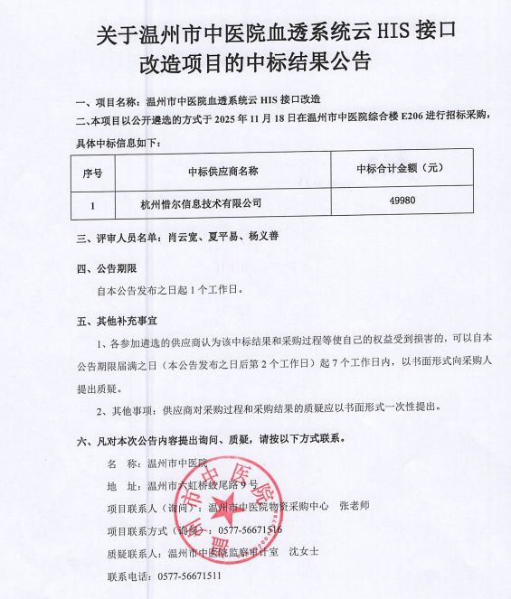 关于温州市中医院血透系统云HIS接口改造项目的中标(成交)结果公告