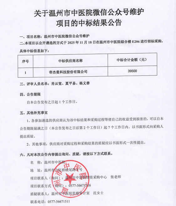 关于温州市中医院微信公众号维护项目的中标(成交)结果公告