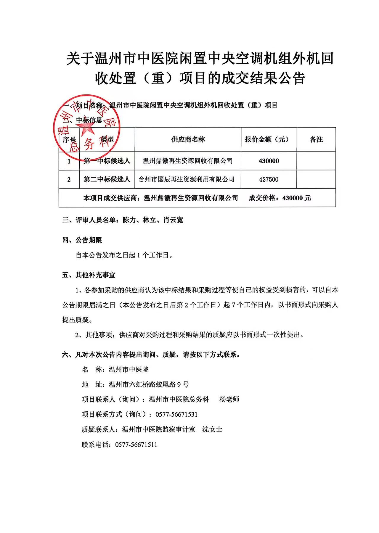 关于温州市中医院闲置中央空调机组外机回收处置(重)项目的成交结果公告