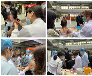 义诊现场吸引了不少人,其中专委会常务委员兼秘书项少茜针对患者痛症对患者相应部位进行拔罐,手法娴熟,在场患者惊叹不已。委员伊仙琼对医护人员进行了腕踝针的指导,在入针部位角度及应用上耐心讲解,并将大家的提问一一解答;常务委员金红露对现场患者进行问诊,查看患者舌苔脉象后对患者进行中医辨证,并在相印穴位上进行耳穴埋豆;常务委员吴倩对疼痛患者进行贴敷疗法,并对患者进行穴位按摩;委员郭秀婷对患者进行血压测量,耐心询问患者既往史并对患者进行生活指导。